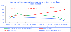 Rather than report just the single (and low) Net Promoter Score and apparently contradictory high satisfaction measure, we looked at satisfaction, then at recommendation in the last year, and those who gave the promoters’ Net Promoter Score rating of 9 or 10 separately from just the Net Promoter Score.