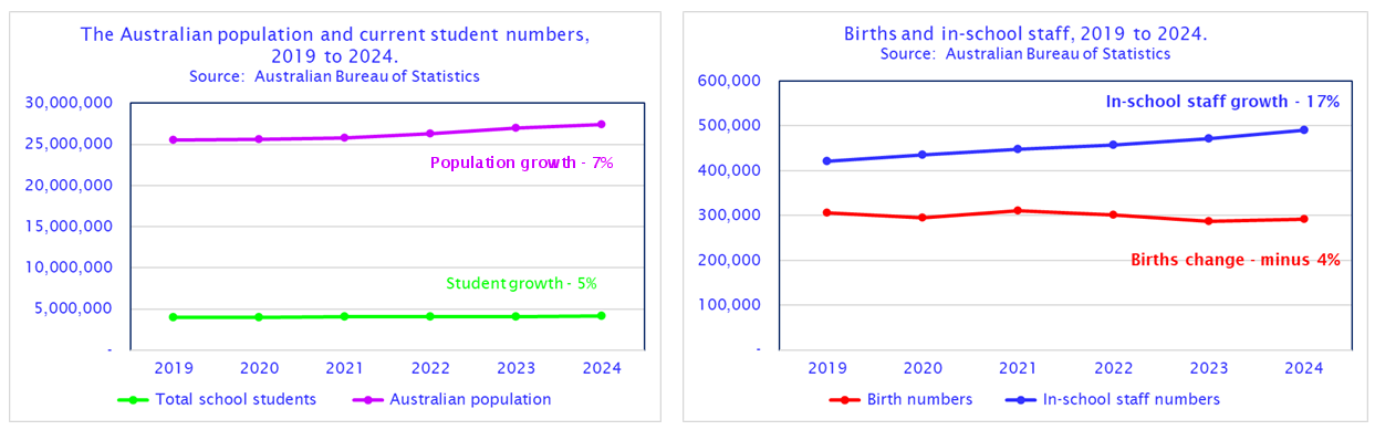 To illustrate, since 2019, the Australian population trend has been of growth (up 7%), as have school student numbers (up 5%), and in-school staff (up 17%).